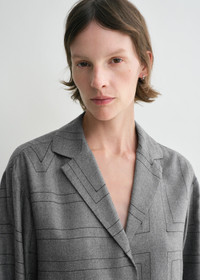 TOTEME pj top made from lightweight modal flannel embroidered with a fine monogram pattern in contrasting thread. It is shaped to a relaxed silhouette with a lapel collar and spacious long sleeves and fastens with mother-of-pearl buttons. Wear it all day with the Monogram flannel pj bottoms. Details & Fit - Smoke - Ivory monogram topstitching; the position of the pattern may differ from the pictures - Button front - 100% modal - Dry cleaning or cool hand wash recommended - Style number 251-WRT976-FB0080 - Relaxed fit, true to size - The model is 178cm/510 tall and wears a size 36