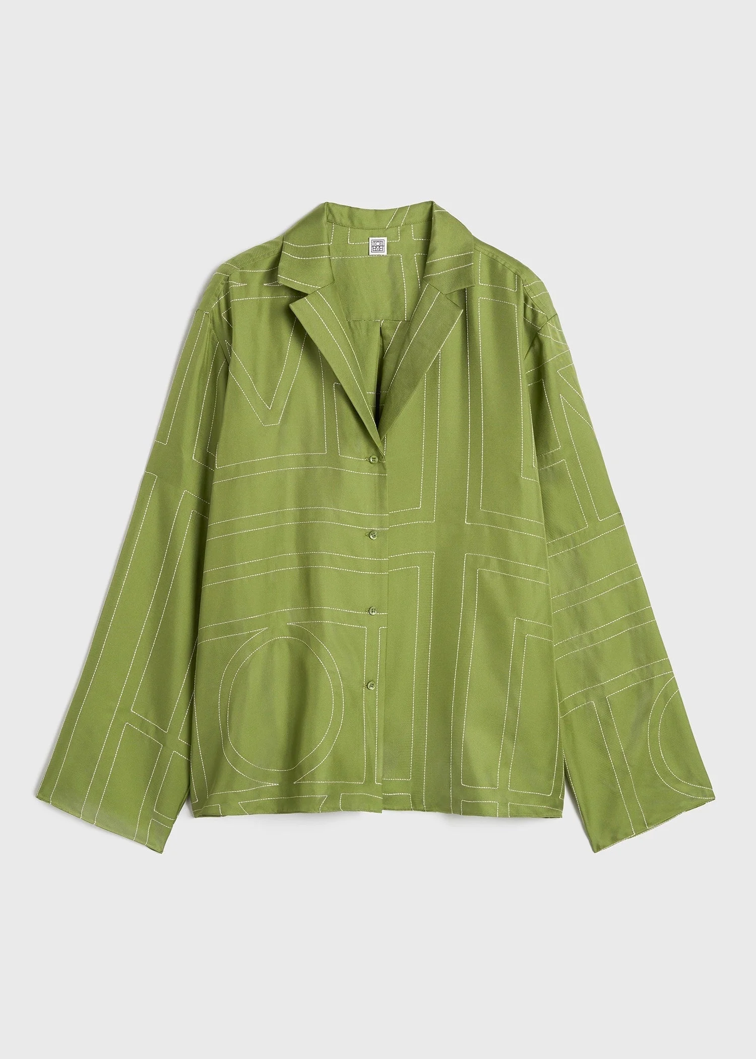 TOTEME blouse made from mid-weight silk twill topstitched with a fine monogram pattern in contrasting ivory thread. It’s shaped to a relaxed silhouette with a lapel collar and spacious long sleeves, and fastens with mother-of-pearl buttons. Wear it all day with the Monogram silk pj bottoms. Details & Fit - Laurel - Ivory monogram topstitch; the position of the pattern may differ from the pictures - Button front - 100% silk - Dry clean - Style number 241-WRT976-FB0089 - The model is 180cm/511 tall and wears a size 36 - Relaxed fit, true to size