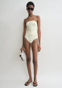 Minimalist swimsuit printed with a new ecru/straw rendition of the TOTEME monogram pattern. It is made from fully lined stretch jersey to a strapless silhouette supported with an internal silicone strip. Complete a stylish poolside look with sunglasses and a sarong. Details & Fit - Ecru/straw - The position of the monogram pattern may differ from the pictures - Ecru and straw monogram print - Full lining, silicone edge - 43% polyamide recycled, 29% polyamide, 28% elastane - 30°C machine wash - Style number 252-WSW1027-FB0221 - The model is 178cm/510 tall and wears a size S - True to size