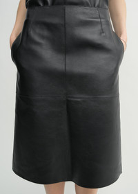 Designer’s note: “Our intention with this TOTEME Garderob piece was to create the quintessential leather skirt by marrying minimalism with a sense of ease. The result is a knee-length A-line silhouette with an impeccable paneled construction that flares softly at the hem, adding a touch of movement. We like to style it sitting at the hips below a crisp, sky-blue shirt to make it feel modern and elevated.” Details & Fit - Black - In-seam pockets - Concealed back zipper - Back slit - Double-faced lambskin Nappa leather with a butter-soft hand - 100% lamb leather - Professional leather clean - Style number 252-WRB0318-LE0056 - The model is 181cm/511 tall and wears a size 36 - True to size, slim hips