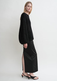 Directional TOTEME sweater knitted by hand to a puffed oversized silhouette. It is made from a light and warm mohair blend with a crew neckline and billowing long sleeves channeling a dramatic mood. Style it over a skirt and sandals. Details & Fit - Black - 56% mohair, 30% recycled polyamide, 14% wool - Cool hand wash - Style number 252-WRT0547-YA0160 - The model is 178cm/510 tall and wears a size S - Oversized fit