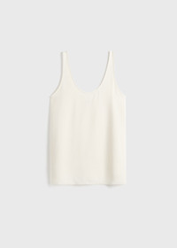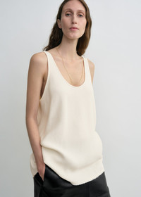 Designer’s note: “What sets this TOTEME Garderob tank apart is its understated scoop neckline and elongated silhouette, elevated by the rich texture of the sable fabric and the raw, frayed hem. Equally stylish when worn tucked or untucked, we imagine it in macadamia white as part of bohemian summer looks and in black for evening edits." Details & Fit - Macadamia - Raw hem - Mid-weight sable with a soft texture and fluid drape - 100% viscose - Dry clean - Style number 252-WRT0510-FB0240 - The model is 181cm/511 tall and wears a size 36 - Relaxed fit, low armholes and long silhouette
