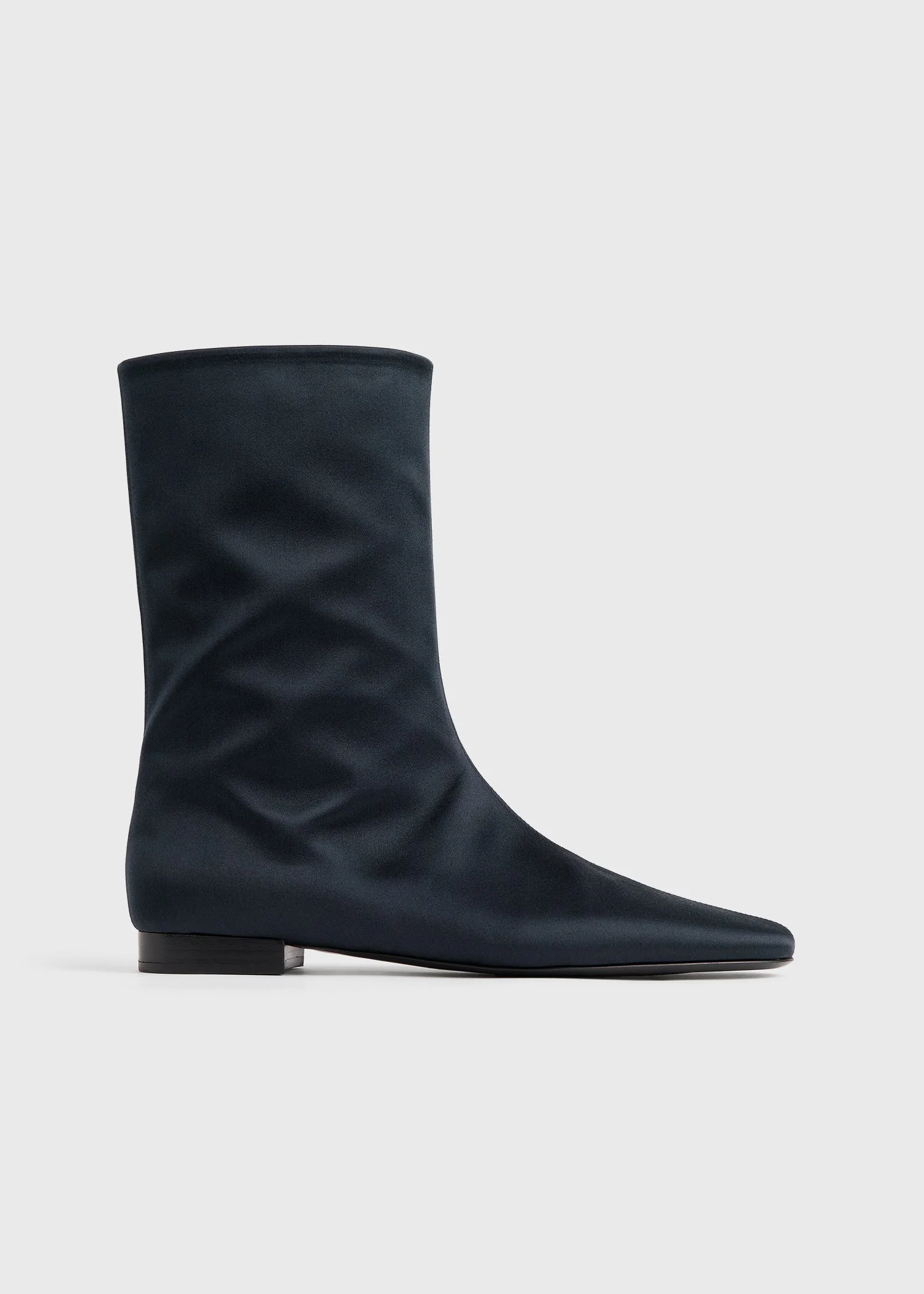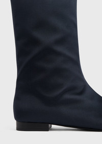 Ankle boots crafted in Italy from lustrous satin to infuse texture into evening ensembles. They have a structured bootie-style silhouette supported with a smooth leather lining and a clean side zipper. Details & Fit - Navy - Side zipper - Leather lining, insole and sole - 78% viscose, 28% silk; lining: 100% sheep leather; sole: 100% cow leather - Care instructions and dust bag included - Style number 254-WAS0264-FB0227 - True to size - True to size