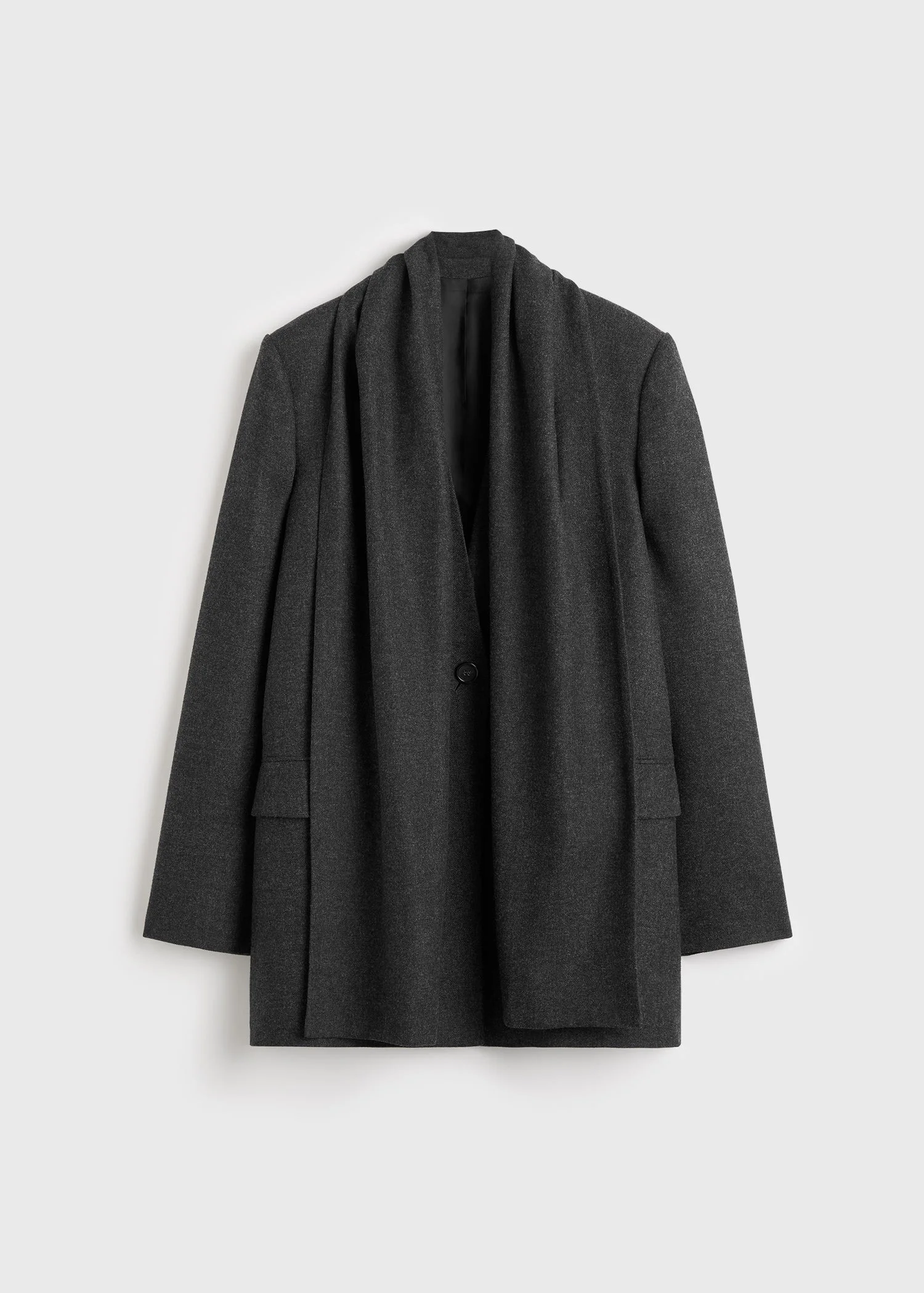 Blazer featuring a sophisticated scarf, a signature accent in our pieces. It is tailored from extra soft and airy melange flannel to a long, straight silhouette with padded shoulders, flap pockets and a single-buttoned front. Inside, the lined interior has an internal pocket. Complete a relaxed suit with the matching trousers. Details & Fit - Charcoal - Detachable scarf, concealed buttons - Button front, flap pockets - Satin lining, internal pocket - 70% viscose, 30% RWS wool; lining: 100% viscose - Dry clean - Style number 254-WRZ0060-FB0472 - The model is 180cm/5'11 tall and wears a size 36 - Straight fit