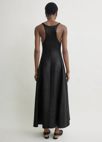Long sleeveless dress cut from fine cotton tweed with a sculptural silhouette. Fitted through the bodice and waist, it flows into a full A-line skirt with a wide hem and clean lines. Details - Black - Concealed back zipper - Side-seam pockets - 51% recycled GRS cotton, 49% cotton - Dry clean - Style number 262-WRT0739-FB0614 Fit information - The model is 180cm/5’11” tall and wears a size 36 - Slim fit, full skirt Origin & Certificates - This product contains 51% Global Recycled Standard (GRS) certified recycled cotton, certified by Control Union, license number 1154443 - Product contains at least 51% recycled content - Made in Portugal - Manufacturer: Priority Season - Material woven in Italy; dyed in Italy