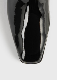 This updated rendition of the TOTEME Riding boots has a square toe with a subtly beveled profile. They are made in Italy from a high-shine patent leather, with a shearling lining, and are finished with a silver-tone monogram plaque. Details & Fit - Black/beige - Beige shearling trim - Leather lining, insole and sole - 100% cow leather - Care instructions and dust bag included - Style number 261-WAS0302-LE0217