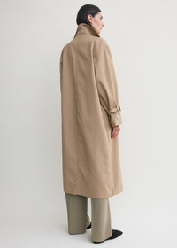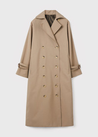 Signature TOTEME trench coat defined with an oversized silhouette that fastens with neat horn buttons along the double-breasted front. It's made from durable and water-repellent organic cotton-blend gabardine and finished with adjustable leather-buckled cuff straps and welt pockets. Wear it unbuttoned to show glimpses of the monogram-printed satin lining. Details & Fit - Khaki beige - Button front - Slip pockets - Brown monogram-print satin lining - 75% Organic organic, 25% recycled polyester; lining: 51% polyester 49% acetate; trim: 100% leather - Dry clean only remove the leather cuff straps before washing - Style number 241-WRO1112-FB0134 - Designed for an oversized fit, go down a size if you prefer a neater look - The model is 177cm/510 tall and wears a size 34