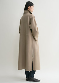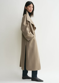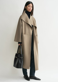 Signature TOTEME coat crafted from soft double, a wool-cashmere winter favorite crafted by hand-stitching two fine layers to achieve a double-faced finish with clean seams. It has an oversized silhouette with fluid shawl lapels and an open front which makes it perfect for layering, then is complete with inseam pockets and side slits. Coordinate it with the Long double scarf in the same color. Details & Fit - Truffle - Open front - Inseam pockets - 90% wool RWS, 10% cashmere - Dry clean - Style number234-WRO885-FB0049 - The model is 180cm/5'11 tall and wears a size 36 - Designed for an oversized fit, go down one or two sizes for a neater look