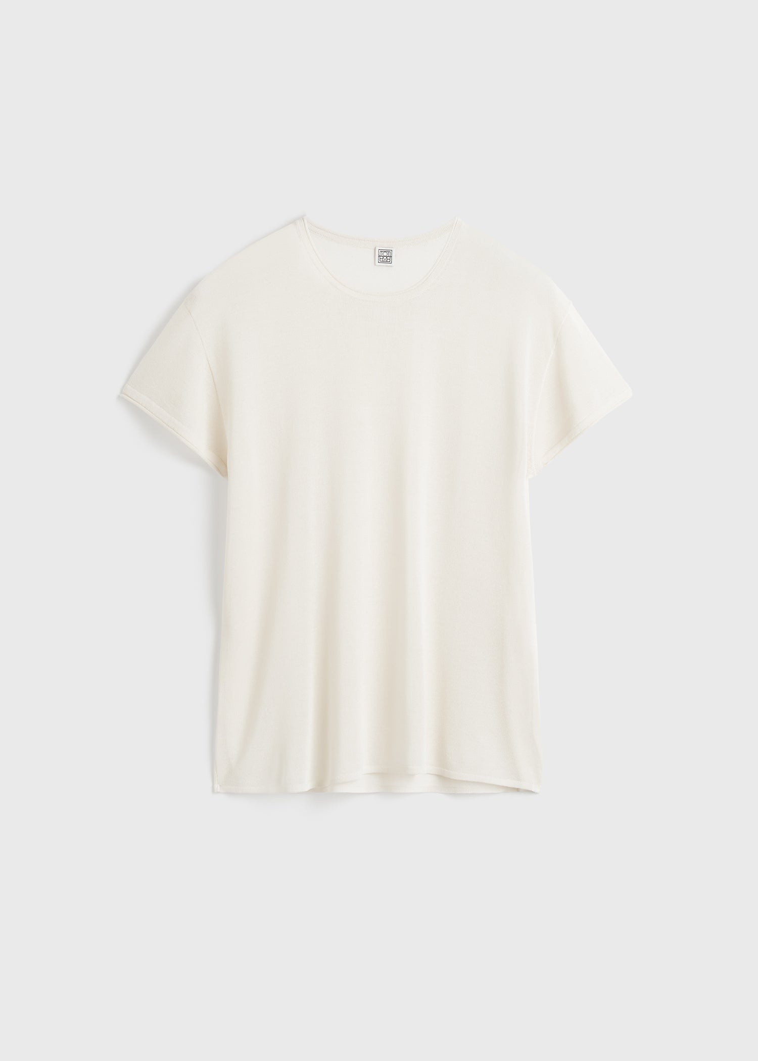 Designer’s note: “This TOTEME Garderob piece marries the ease of a classic tee with the refinement of a silk fabric finished with minimalist rolled edges. Here we style it with jeans and pumps for a modern take on everyday dressing.” Details & Fit - Ecru - Rolled edges - Light, semi-sheer silk crepe - 100% silk - Cool hand wash - Style number 252-WRT0476-YA0173 - The model is 181cm/511 tall and wears a size S - True to size, regular fit and spacious short sleeves with dropped shoulders