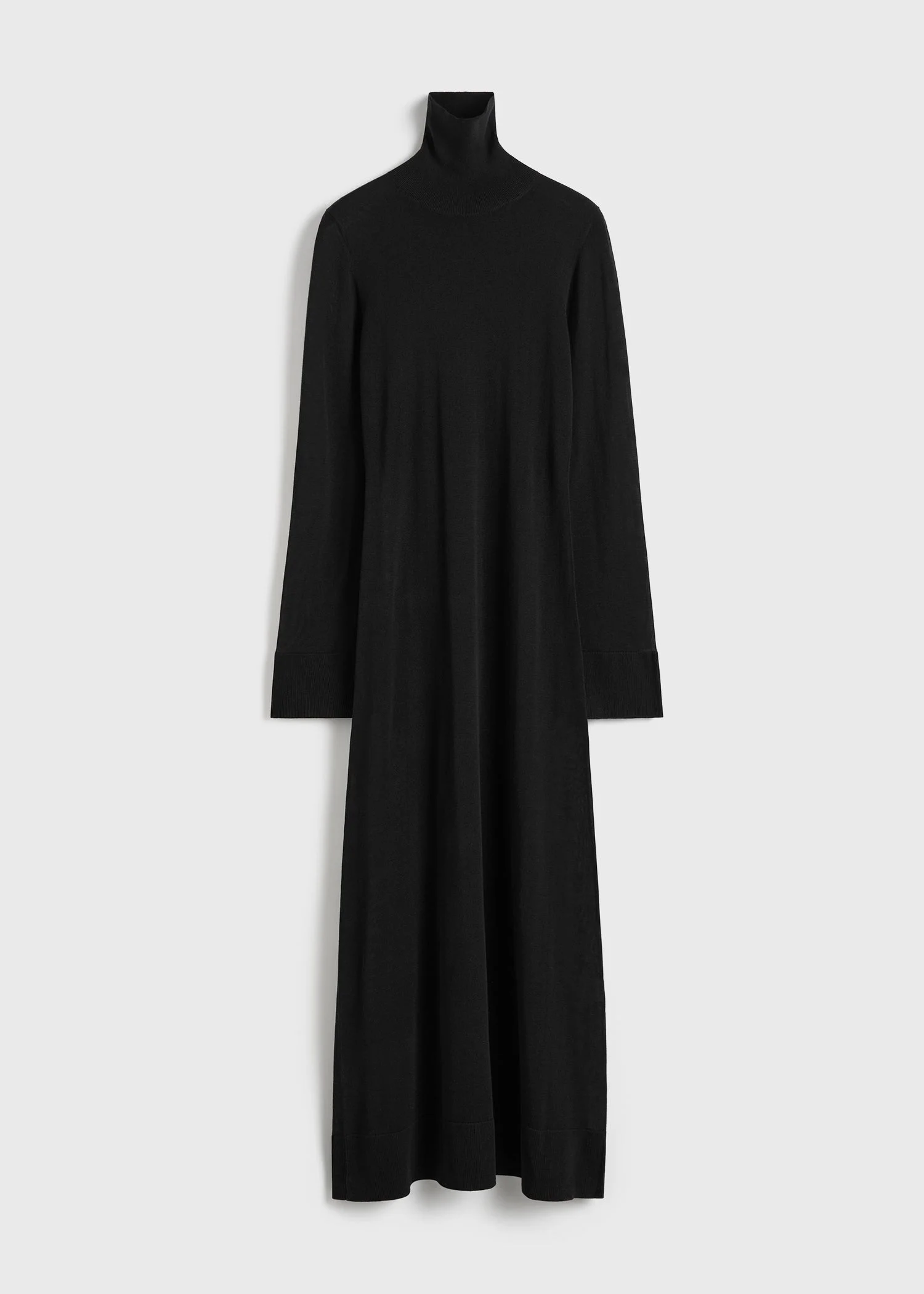 This floor-length turtleneck dress is a striking piece from the TOTEME Summer 25 runway collection. It is finely knitted for a daring play on opacity and features slits at the cuffs for dramatic effect. Add a pendant necklace to tap into the collection's modern take on bohemia. Details & Fit - Black - Turtleneck - Cuff slits - Light, semi-sheer knit - 90% lyocell, 10% cashmere - Cool hand wash - Style number 253-WRD0236-YA0079 - The model is 181cm/511 tall and wears a size S - True to size
