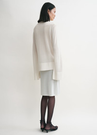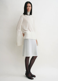 A foundational piece from the Summer 25 runway, this TOTEME turtleneck sweater is designed with high cuff slits for dramatic effect. It is finely knitted from Lyocell with a hint of cashmere – a breathable blend inspired by crisp Scandinavian summer nights. Team it with high leather gloves or a delicate bracelet. Details & Fit - White - High cuff slits - Hem slits - Light, semi-sheer knit - 90% lyocell, 10% cashmere - Cool hand wash - Style number 253-WRT0535-YA0079 - The model is 181cm/511 tall and wears a size 36 - True to size, regular fit