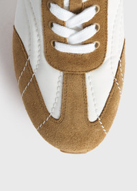 TOTEME sneakers reworked in a bicolor combination for a sporty feel. They're made in Portugal from monogram-quilted recycled polyamide paired with tan suede and set on a foam midsole with a bright orange insert. Team them with leggings on your way to a workout. Details & Fit - White/tan - Cotton laces - Terry-cotton lining, leather insole - Rubber sole - 100% Recycled polyamide - Care instructions and dust bag included - Style number 241-WAS1544-FB0137 - True to size