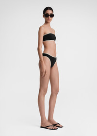 Minimalist bikini bottoms inspired by the contrasting stripes on TOTEME's Centered monogram silk scarf. They're made from fully lined stretch jersey to a mid-waisted, medium-legged silhouette with contrasting edges. Wear them with the coordinating bikini top or mix and match with the opposite color combination. Details & Fit - Black - Light hay trim - Fully lined - 71% Recycled polyamide, 29% elastane - 30°C Machine wash - Style number 241-WSW1040-FB0097 - The model is 175cm/59 tall and wears a size S - True to size
