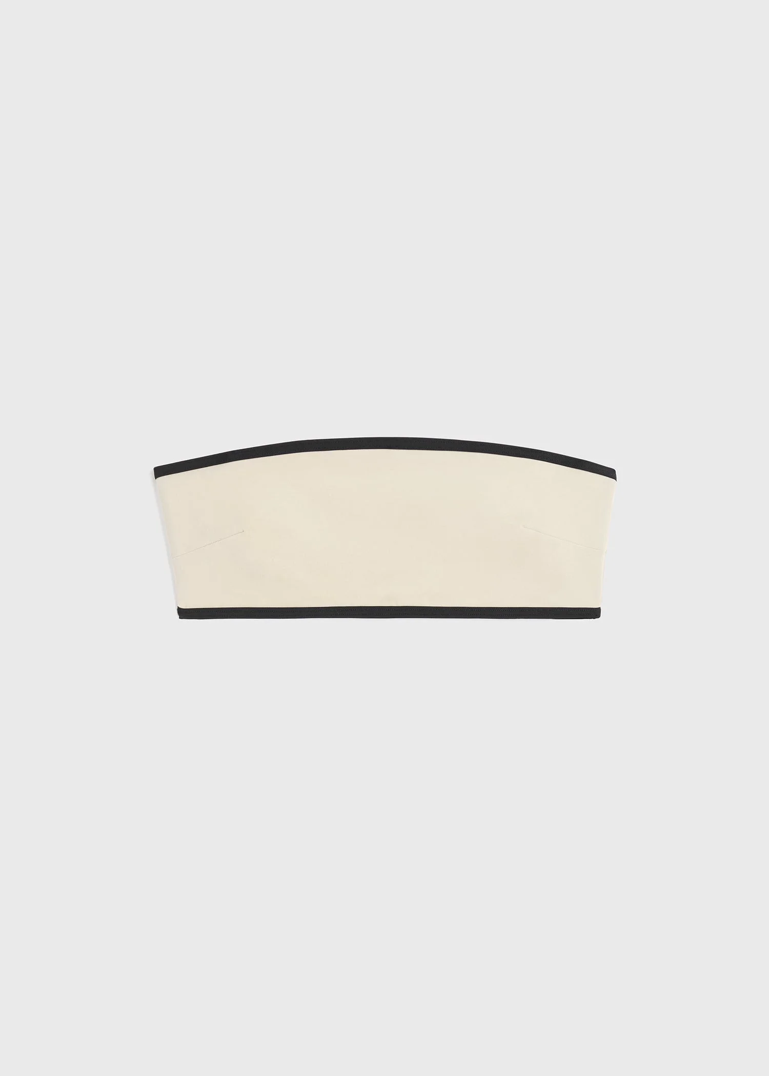 Minimalist bikini top inspired by the contrasting stripes on TOTEME's Centered monogram silk scarf. It's made from fully lined stretch jersey to a strapless bandeau silhouette that's supported with a silicone trim inside. Wear it with the coordinating bikini bottoms or mix and match with the opposite color combination. Details & Fit - Light hay - Black trim - Fully lined - 71% Recycled polyamide, 29% elastane - 30°C Machine wash - Style number 241-WSW1041-FB0097 - The model is 175cm/59 tall and wears a size S - True to size