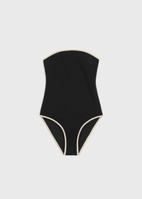 Minimalist swimsuit inspired by the contrasting stripes on TOTEME's Centered monogram silk scarf. It's made from fully lined stretch jersey to a strapless silhouette that's supported with a silicone trim inside. Wear it at the beach with a sarong and sandals. Details & Fit - Black - Light hay trim - Fully lined - 71% Recycled polyamide, 29% elastane - 30°C Machine wash - Style number 241-WSW1027-FB0097 - The model is 175cm/59 tall and wears a size S - True to size