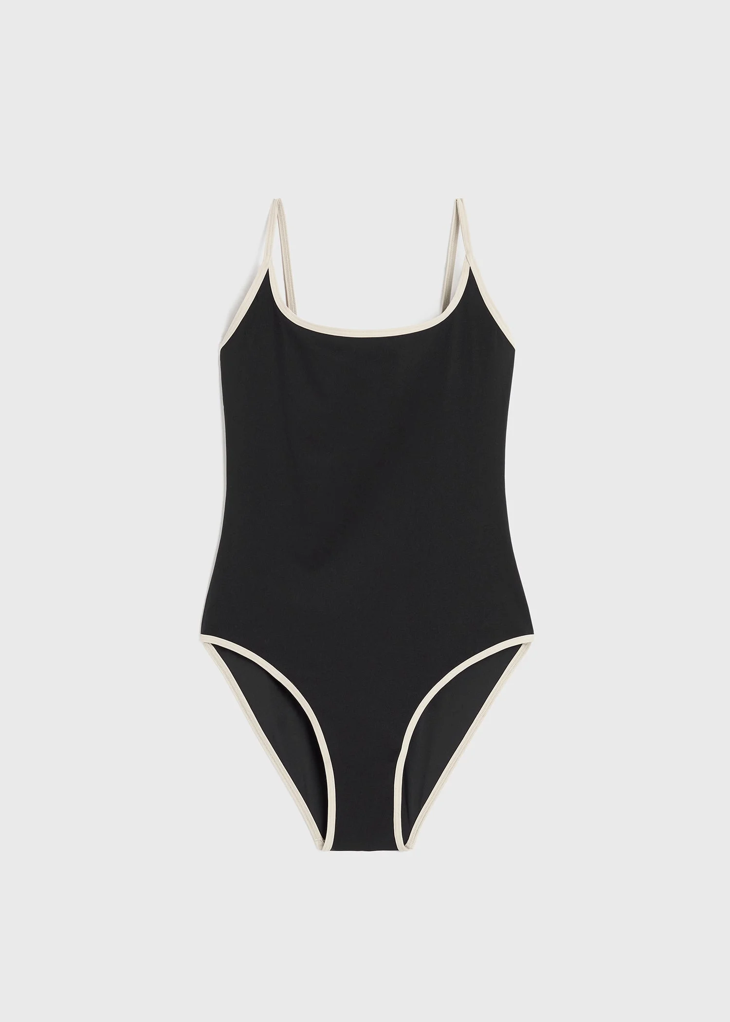Minimalist swimsuit inspired by the contrasting stripes on TOTEME's Centered monogram silk scarf. It's made from fully lined stretch jersey to a rounded square-neck silhouette with adjustable shoulder straps. Add a scarf and sunglasses to relax by the pool. Details & Fit - Black - Light hay trim - Fully lined - 71% Recycled polyamide, 29% elastane - 30°C Machine wash - Style number 241-WSW1031-FB0097 - The model is 175cm/59 tall and wears a size S - True to size