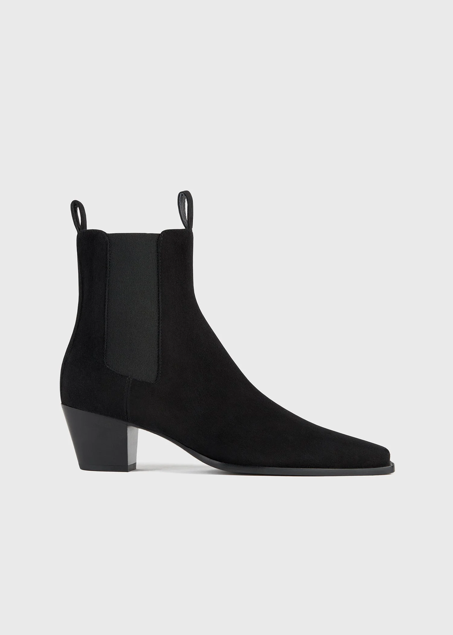 City boots with a modern silhouette conceived as a fusion between TOTEME's The Western Boot and The Mid Heel Boot. They're made in Italy from suede with front and back pull tabs, elasticated side panels, and a stacked block heel with a rubber tip. Look closer to appreciate the skilled welt construction. Details & Fit - Black suede - Front and back pull tabs - Elasticated side panels - Leather sole, rubber insert - 100% Sheep leather; lining: 100% sheep leather - Care instructions and dust bag included - Style number 234-WLGSE074-LE0018 - Average heel height 50mm/2" proportional to shoe size - True to size, narrow fit at the front