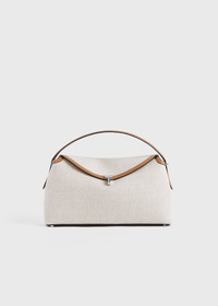 Everyday TOTEME bag outlined with a curved flap that complements the shape of the arm. It is crafted in Italy from cotton-blend canvas trimmed with tan-brown leather and a silver-tone metal T-Lock, then fitted with two internal slip pockets. Carry it from the top handle or the detachable and adjustable strap for different styling options. Details & Fit - Ecru/tan - Detachable, adjustable strap (must be attached with the clasp opening facing inwards) - Silver-tone twist lock - Internal slip pockets - 44% organic cotton, 44% linen, 12% acrylic - Care instructions and dust bag included - Style number 243-WAL961-FB0234 - Strap drop length: adjustable (45cm/17.8" on middle hole) - Top handle drop 18cm/7.1'' - Height 17cm/6.7'' - Width 35cm/13.7'' - Depth 11.5/4.5''