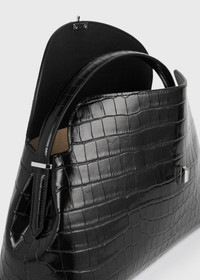 Everyday TOTEME bag outlined with a curved flap that complements the shape of the arm. It is crafted in Italy from crocodile-effect leather set with a silver-tone metal T-Lock, then fitted with two internal slip pockets. Carry it from the top handle or the detachable and adjustable strap for different styling options. Details & Fit - Black croco - Detachable, adjustable strap (must be attached with the clasp opening facing inwards) - Silver-tone twist lock - Microsuede lining, internal slip pockets - 100% cow leather; lining: 60% polyurethane, 40% polyamide - Care instructions and dust bag included - Style number 243-WAL961-LE0076 - Strap drop length: adjustable (45cm/17.8" on middle hole) - Top handle drop 18cm/7.1'' - Height 17cm/6.7'' - Width 35cm/13.7'' - Depth 11.5/4.5'' - Strap drop length: adjustable (45cm/17.8" on middle hole) - Top handle drop 18cm/7.1'' - Height 17cm/6.7'' - Width 35cm/13.7'' - Depth 11.5/4.5''
