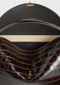 Everyday TOTEME bag outlined with a curved flap that complements the shape of the arm. It is crafted in Italy from crocodile-effect leather set with a gold-tone metal T-Lock, then fitted with two internal slip pockets. Carry it from the top handle or the detachable and adjustable strap for different styling options. Details & Fit - Dark brown croco - Detachable, adjustable strap (must be attached with the clasp opening facing inwards) - Gold-tone twist lock - Microsuede lining, internal slip pockets - 100% cow leather; lining: 60% polyurethane, 40% polyamide - Care instructions and dust bag included - Style number 243-WAL961-LE0076 - Strap drop length: adjustable (45cm/17.8" on middle hole) - Top handle drop 18cm/7.1" - Height 17cm/6.7" - Width 35cm/13.7" - Depth 11.5/4.5" - Strap drop length: adjustable (45cm/17.8" on middle hole) - Top handle drop 18cm/7.1" - Height 17cm/6.7" - Width 35cm/13.7" - Depth 11.5/4.5"