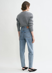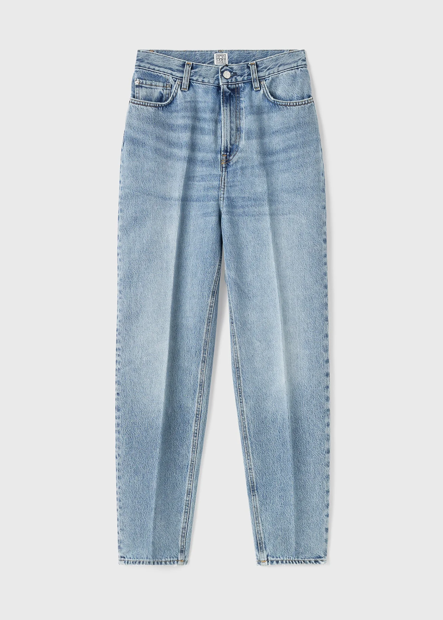 TOTEME jeans inspired by tailored trousers with carrot-shaped tapered legs that fit loosely at the hips and thighs. They're made in Italy from structured organic-cotton denim that will mold to fit you perfectly over time, and have a mid waist with a zipper fly, five pockets, and a monogram-debossed leather patch. Add flats for a walk in the park or boots for a dinner date. Details & Fit - Worn blue - Zipper fly, silver-tone hardware - Belt loops, five pockets - Monogram leather patch - 100% Organic cotton - 30°C Machine wash - Style number 223-231-741 - Mid-waist, loose fit at hips and thighs - The model is 178cm/510 tall and wears a size 27/34 - Relaxed fit on the hips, consider taking a size down