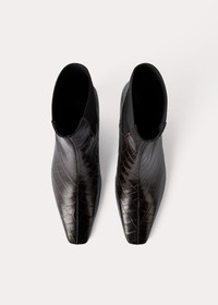TOTEME ankle boots made in Italy from croco-debossed leather. They are shaped to a sleek silhouette with a squared pointed toe, an elongated shaft with elasticated panels, a pull tab at the back, and a leather-covered heel that measures 50mm. Wear them throughout the year with your favorite jeans. Details & Fit - Dark brown croco - Black leather lining - 100% Calf leather, lining: 100% sheep leather; sole: 100% calf leather - Care instructions and dust bag included - Style number 231-907-847 - Average heel height 50mm/2" proportional to shoe size - Narrow fit if you have wide feet, take one size up