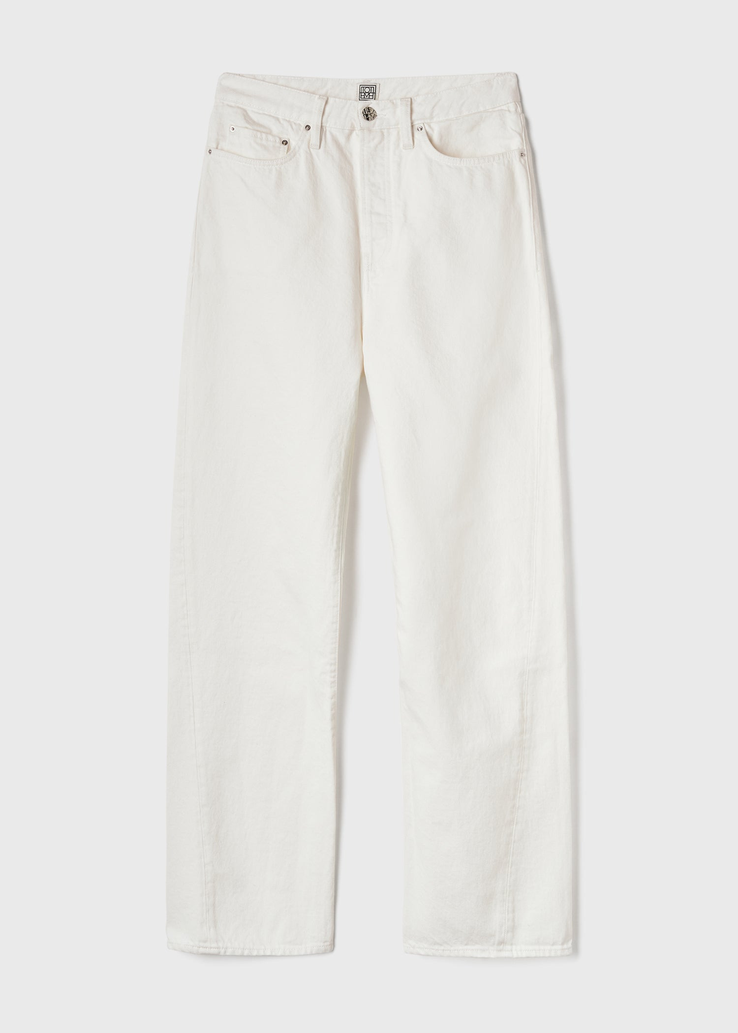 Building on TOTEME's Twisted seam denim, these jeans have a low-to-mid waistline and slightly wider and longer straight legs with some space at the thighs. They're made in Italy from mid-weight and rigid organic-cotton denim that's finished with five pockets, a leather monogram patch and a button fly. Wear them as intended for a relaxed fit or go down a size for a more fitted look. Details & Fit - Off-white - Button fly, silver-tone hardware - Belt loops, five pockets - Monogram leather patch - 100% Organic cotton - 30°C Machine wash - Style number 231-240-748 - Low-to-mid waist, long straight legs - The model is 178cm/510 tall and wears a size 26/34 - This style can run big, choose your usual size for a relaxed look or consider taking a size down