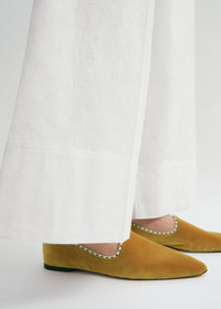 Designer’s note: “Our take on the timeless Venetian slippers, these indoor shoes embody the effortlessly dressed spirit of the TOTEME Garderob curation through an elongated silhouette accented with monochrome piping. Updated in a lively saffron tone, they comfortably hug the foot with soft velvet lined in leather. We like wearing them to entertain guests or travel.” Details & Fit - Saffron - White and black piping - Leather lining, insole and sole - Rubber heel - 100% polyester recycled; lining: 100% sheep leather; sole: 100% cow leather - Care instructions and dust bag included - Style number 252-WAS0224-FB0420 - True to size
