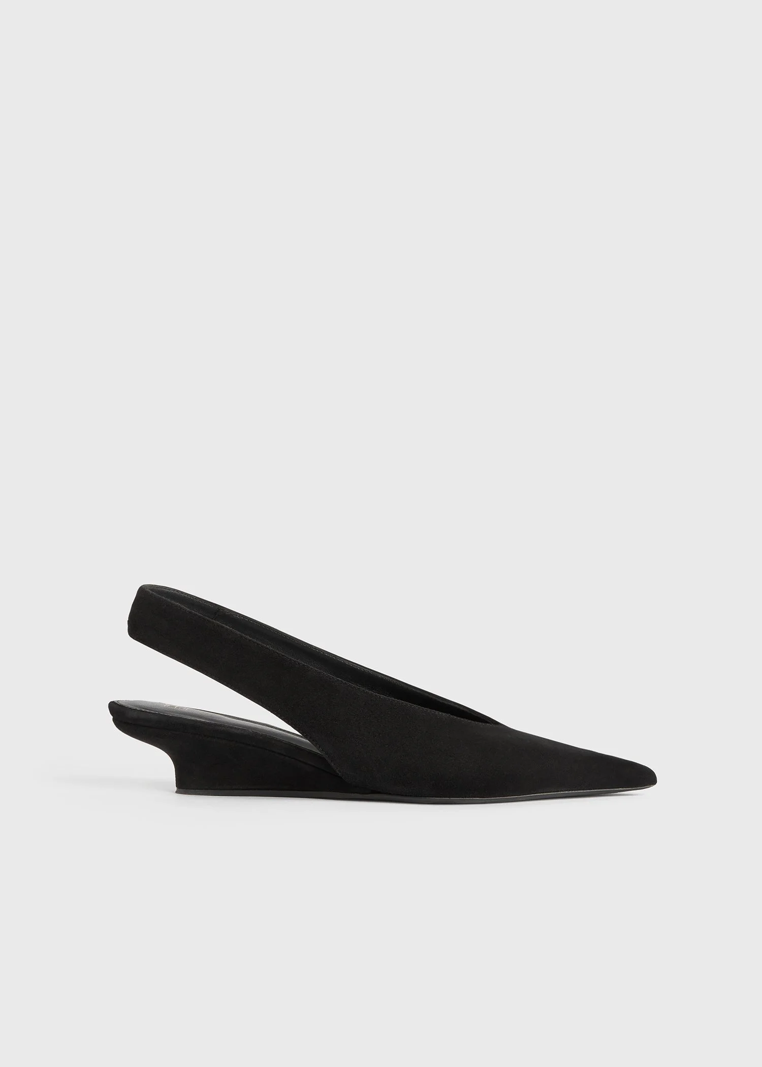 Seen throughout the FW24 runway show, these TOTEME slingback pumps are set on a demure 40mm heel with a tapered half-wedge silhouette. They are crafted in Italy from suede lined in leather and are elasticated at the back for a comfortable fit. Wear them with slouched trousers for a directional touch. Details & Fit - Black - Elasticated slingback strap - Leather lining - Half-wedge heel - 100% calf leather; lining: 100% sheep leather; sole: 100% cow leather - Care instructions and dust bag included - Style number 244-WAS0165-LE0012 - Average heel height 40mm/1.6" proportional to shoe size - True to size