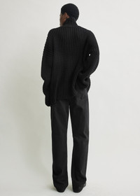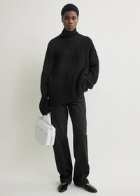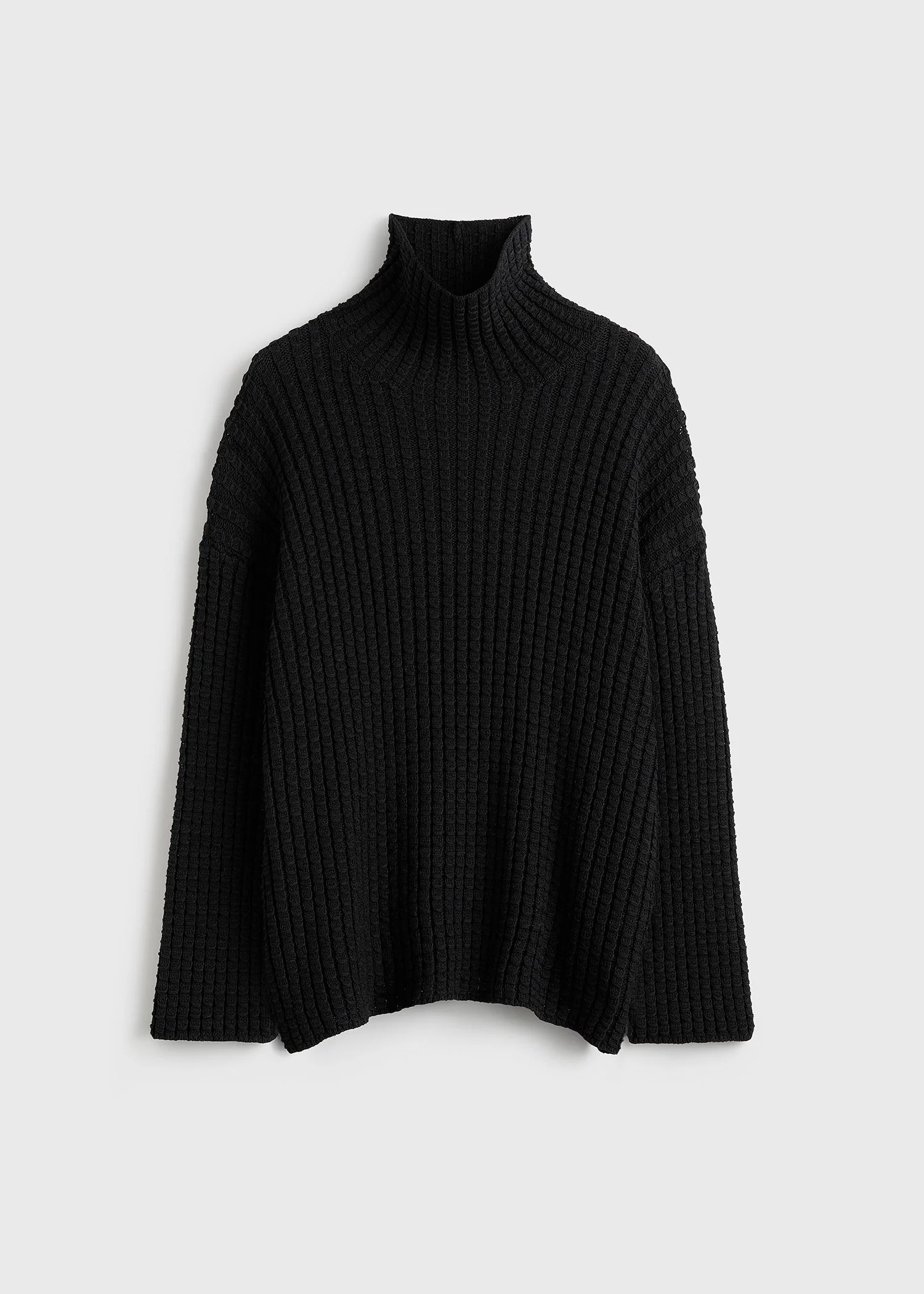 Top knitted from a soft cotton blend with a graphic whipstitch weave, a TOTEME signature. The straight, oversized silhouette extends from the high collar to the long sleeves. Details - Black - Dropped shoulders - 92% cotton, 8% polyamide - Dry clean - Style number 262-WRT0680-YA0148 Fit information - The model is 180cm/5'11” tall and wears a size S - Oversized fit with dropped shoulders, wide sleeves Origin & Certificates - Made in China - Manufacturer: Competent Corporation Ltd. - Material knit in China; dyed in China