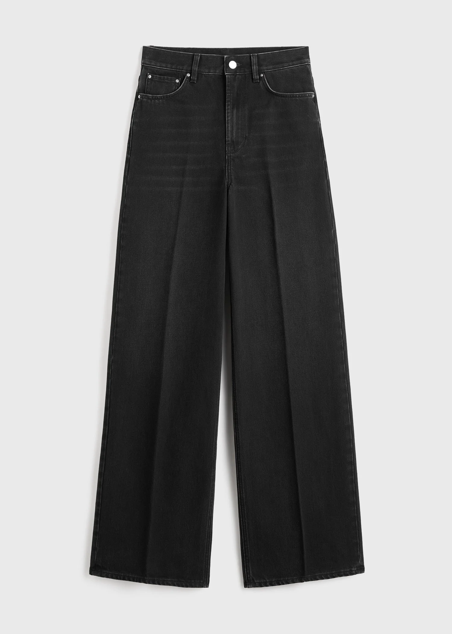 TOTEME jeans with a high waistline and extra-long, wide legs that are press-creased for definition. They are made in Italy from mid-weight organic-cotton denim with silver hardware and a zipper fly. Style them with flat loafers to showcase the modern silhouette. Details & Fit - Faded black - Belt loops, five pockets - Zipper fly - Leather patch - 100% cotton organic - 30°C machine wash - Style number 251-WRB2426-FB0046