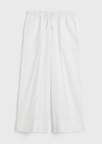 Designer's note: "These TOTEME Garderob trousers are cut with a spacious wide-leg silhouette that balances casual ease with sartorial precision. Made from a crisp linen-cotton blend with a semi-sheer finish, they capture the breezy mood of summer and are set with delicate drawstrings at the waist. Pair them with the coordinating shirt for an effortless warm-weather look." Details & Fit - White - Light, semi-sheer fabric - Elasticated drawstring waistband - Side and back pockets, embroidered monogram - 55% cotton, 45% linen - Cool hand wash - Style number 253-WRB0325-FB0458 - The model is 180cm/511 tall and wears a size 36 - True to size, dropped crotch and wide legs