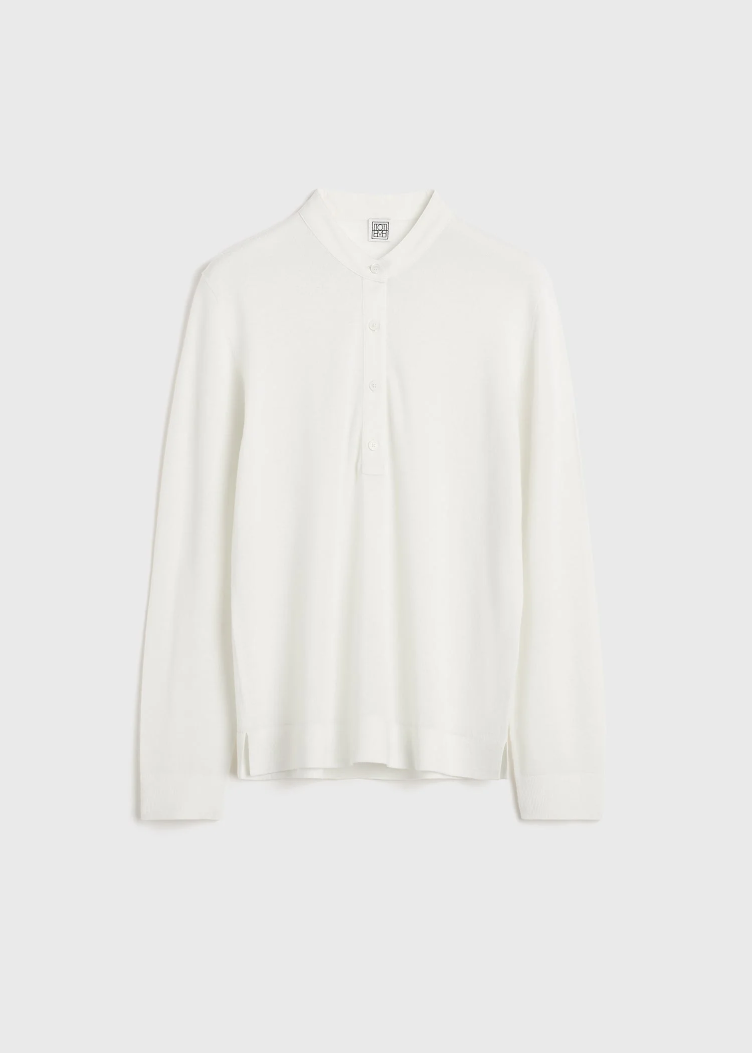 Designer's note: "We designed this TOTEME Garderob top as a refined base layer for travel or cool summer evenings. It’s knitted from a lightweight jersey combining warm merino wool with soft silk and finished with a crisp poplin button placket. The slim arms and relaxed silhouette create an effortless yet sophisticated mood." Details & Fit - Off-white - Buttoned poplin half placket - Side-hem slits - Lightweight, semi-sheer jersey - 70% wool RWS, 30% silk - Cool hand wash - Style number 253-WRT0524-YA0190 - The model is 180cm/511 tall and wears a size S - True to size, regular fit