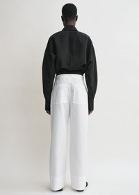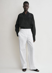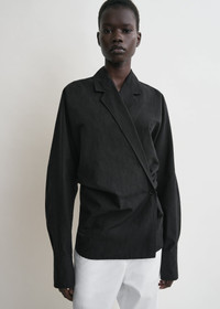 TOTEME wrap blouse conceived with rounded batwing sleeves tempered by a slim, buttoned waistline, creating sculptural volumes. Complete a monochrome look with white trousers. Details & Fit - Black - Batwing sleeves - One-button wrap waist - Buttoned cuffs - Mid-weight fabric with subtle texture - 74% cotton organic, 26% linen - Dry clean - Style number 253-WRT0543-FB0425 - The model is 176cm/59 tall and wears a size S - True to size, fastens at the waist with a slim fit