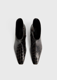 Designer's note: "We gave the classic Chelsea boots a practical side zipper for in-and-out ease. They're shaped from polished, croco-embossed leather with an elongated silhouette and our signature square toe." Details & Fit - Dark brown - Side zipper - 100% cow leather; lining: 100% sheep leather; sole: 100% cow leather - Care instructions and dust bag included - Style number 254-WAS0206-LE0076 - True to size
