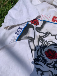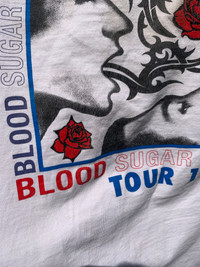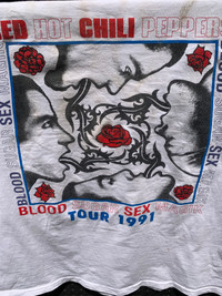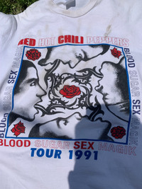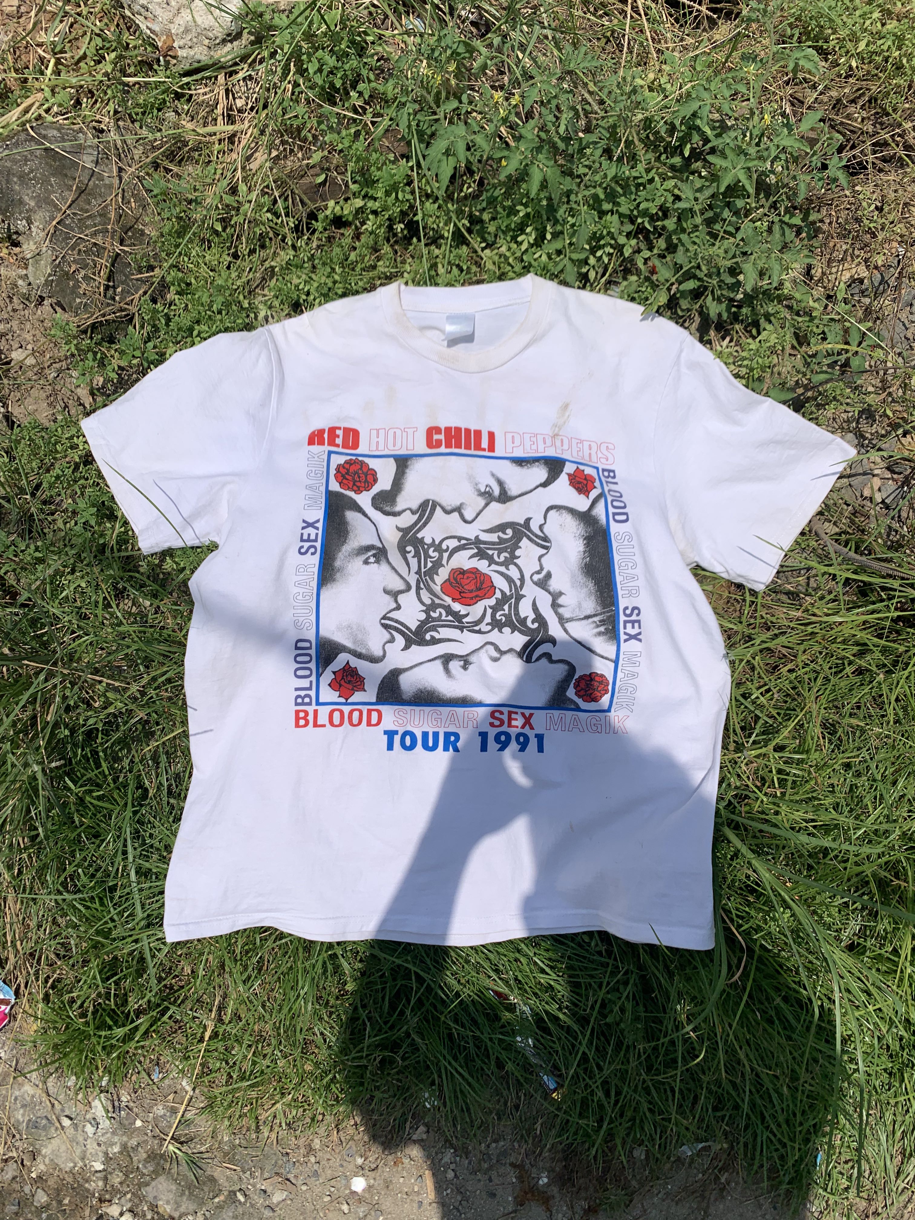 RARE VINTAGE 90s RED HOT CHILI PEPPERS 'PEACE LOVE CHILI PEPPERS' T-SHIRT Description: Unleash the funk rock energy with this incredibly rare vintage Red Hot Chili Peppers (RHCP) t-shirt from the 90s! This black tee features a bold and instantly recognizable graphic on the front: the iconic RHCP asterisk logo, surrounded by text that reads "PEACE LOVE CHILI PEPPERS." The design is simple, impactful, and perfectly captures the band's unique blend of rock, funk, and punk. The back of the shirt is plain, allowing the striking front graphic to be the focal point. This shirt is on a classic black tag, indicating its genuine vintage origin from the 90s, when RHCP was at the peak of their global fame. This is an absolute must-have for any serious RHCP collector or fan of 90s alternative rock. A Little Story Behind the Shirt: The 1990s were a monumental decade for Red Hot Chili Peppers. Following the success of Blood Sugar Sex Magik (1991), which brought them mainstream fame with hits like "Under the Bridge" and "Give It Away," and their continued evolution through albums like One Hot Minute (1995) and Californication (1999), RHCP became one of the most beloved and enduring bands in alternative rock. The phrase "Peace Love Chili Peppers" perfectly encapsulates their free-spirited, eclectic, and often psychedelic ethos. This t-shirt, featuring their iconic asterisk logo, was likely widely available during their extensive tours in the mid-to-late 90s, serving as a wearable testament to their unique blend of raw energy and heartfelt lyricism. Owning this tee connects you directly to a band that defied genres and created a sound uniquely their own. Condition: This shirt is in good vintage condition with some signs of age-appropriate wear. * Fading: The black fabric has a nice, even fade, giving it an authentic vintage look and feel. * Graphic: The graphic print of the asterisk logo and text on the front is largely intact. There is some minor cracking and distress on the print, which is typical for a shirt of this age and adds to its vintage character, but no major flaking. The white/off-white print is still clear. * Damage: There are no visible rips, holes, or major stains. The collar and seams are solid, showing only light, natural wear. * Tag: The original black tag is present and visible, but not fully readable from the photos. Measurements: * Size: Not explicitly labeled on the visible part of the tag, but based on visual assessment. * Width (Pit-to-Pit): 60 cm (approx. 23.6 inches) * Length (Top of Shoulder to Hem): 76 cm (approx. 29.9 inches) Shipping: * Shipping from Indonesia. * Worldwide shipping is available. DM me for offers or questions! Hashtags for Instagram & Grailed: #redhotchilipeppers #rhcp #vintagebandtee #vintagetee #90smusic #bandmerch #bandtee #90sfashion #vintageclothing #vintagestyle #rocknroll #vintage #anthonymichaelkiedis #flea #chadsmith #johnfrusciante #musiclegend #bandshirt