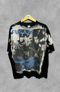 Unique Vintage Fugazi Bleach-Treated Graphic T-Shirt - Black Discover a truly one-of-a-kind piece for fans of Fugazi and alternative music: a vintage Fugazi t-shirt with a striking, hand-treated bleach effect. This tee combines iconic band imagery with a unique distressed aesthetic. The Story Behind the Tee: Fugazi, a seminal post-hardcore band, has always stood for independence, integrity, and a DIY ethos. While official merchandise often reflected their straightforward approach, many fans, inspired by their anti-establishment stance, created their own custom pieces. This particular shirt, with its intentional bleach treatment, embodies that spirit of individualism and artistic expression. The front features a collage of band imagery, including iconic photos of Ian MacKaye and Guy Picciotto, while the back presents a raw, abstract bleach design. This isn't just a band tee; it's a wearable piece of art that reflects the rebellious and creative energy that Fugazi championed. It's likely a custom or fan-made piece, making it incredibly unique and a statement for any true fan. Condition Details: This vintage tee is in good, worn condition, with its unique bleach treatment being a key characteristic. * Fabric: The black cotton fabric has a soft, worn-in feel. The "100% Cotton, One Size Fits All" tag is visible. * Bleach Treatment: The defining feature of this shirt is its unique bleach treatment, which creates white/grey splatters and abstract patterns across the front and back. This effect is intentional and adds to the vintage, distressed aesthetic. There are also smaller white paint splatters around the collar area, further contributing to its raw, artistic look. * Front Print: The blue and black Fugazi graphic on the front is visible, with some blending and distressing from the bleach treatment. The images of the band members are still discernible within the artistic chaos. * Back: The back features a large, abstract bleach pattern, creating a striking contrast against the black fabric. * Collar/Seams: The collar and seams are generally intact, showing normal vintage wear. * Overall Wear: The shirt's condition is directly tied to its custom bleach treatment, which gives it a faded and distressed appearance throughout. There are no major holes or tears, but the overall look is one of a well-loved and creatively altered vintage garment. Please examine all provided photos closely as they are an integral part of the description and best illustrate the current condition and unique characteristics. Measurements: * Width (pit-to-pit): 60 cm (approx. 23.6 inches) * Length (collar to hem): 75 cm (approx. 29.5 inches) Shipping & Inquiries: This item ships from Indonesia. For any questions, offers, or further details, please feel free to send me a direct message. Hashtags #Fugazi #IanMacKaye #DischordRecords #PostHardcore #VintageBandTee #VintageTshirt #BandMerch #DIYFashion #CustomTee #BleachDye #UniqueVintage #MusicApparel #RetroFashion #ConcertTee #RareVintage #90sMusic #Grailed #Streetwear #MensFashion