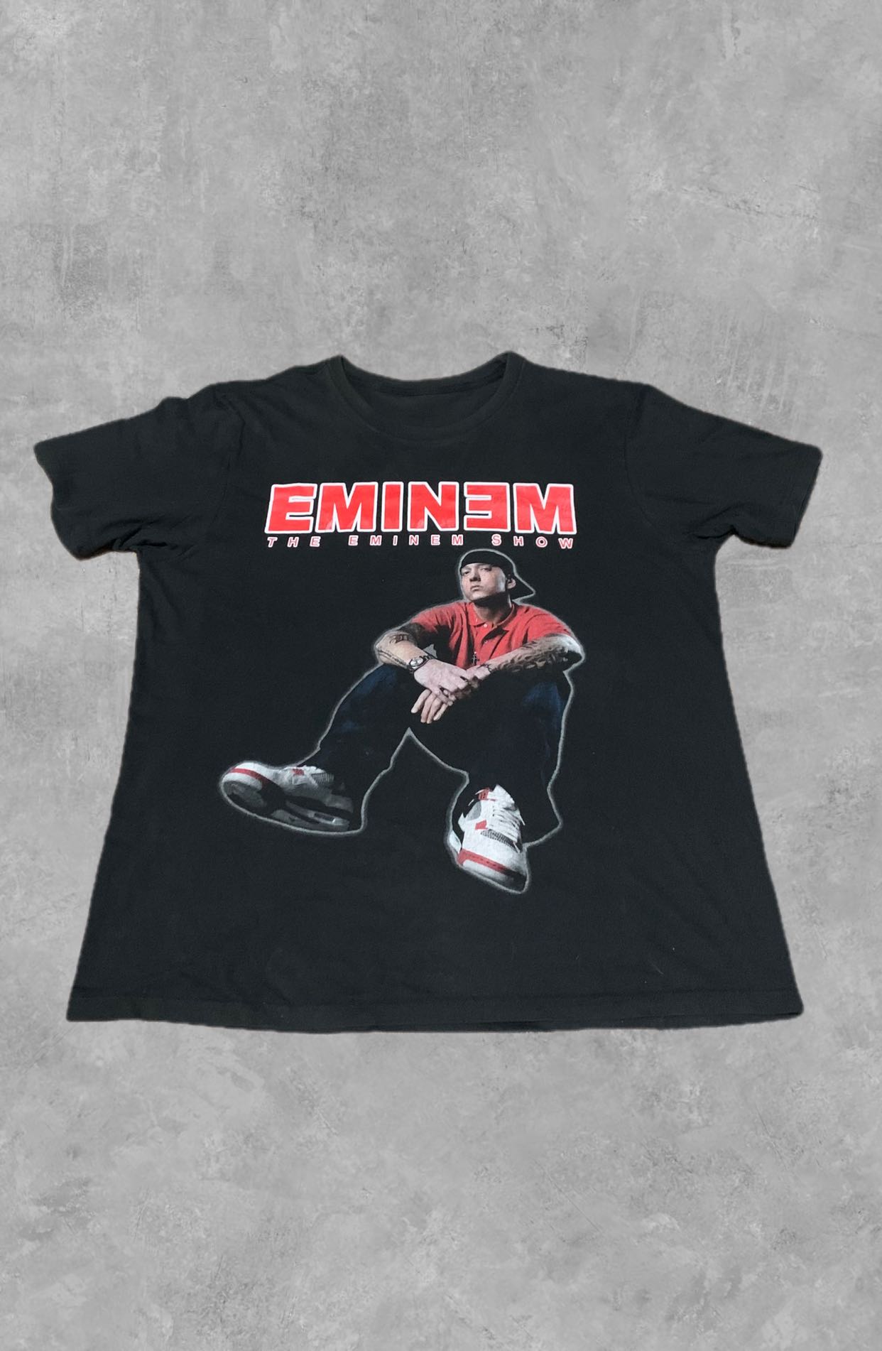 Vintage Y2K Eminem "The Eminem Show" Album Cover Graphic Tee Product Description: This is a classic vintage Eminem t-shirt, celebrating his iconic album "The Eminem Show." The front of the tee features a striking graphic of Eminem himself, posed as seen on the album cover, with the bold "EMINEM" logo and "THE EMINEM SHOW" text above. The back of the shirt prominently displays the "EMINEM" logo along with a distinctive tribal-style graphic, adding to its early 2000s aesthetic. This shirt is a must-have for any fan of the legendary rapper and hip-hop history. Made from what appears to be a comfortable 100% cotton fabric. Why This Shirt Was Made: This shirt was produced as official merchandise to promote "The Eminem Show" album, which was a massive commercial and critical success. Album-themed tees like this allowed fans to connect directly with the music, express their fandom, and participate in the cultural phenomenon surrounding Eminem during that era. Condition Details: This vintage Eminem t-shirt is in good, pre-owned condition, especially considering its age. There are no major rips, tears, or holes. The black fabric shows some light, even fading consistent with a well-loved vintage item. The graphic prints on both the front and back are largely intact, showing some natural cracking and slight distress, which is typical for screen prints from the early 2000s and adds to its authentic vintage character. Please examine all provided photos closely for the most accurate depiction of its condition. Measurements: * Width: 60 cm (23.62 inches) * Length: 74 cm (29.13 inches) Shipping & Inquiries: Shipping from Indonesia. Feel free to send a message for offers or any questions! Hashtags : #Eminem #TheEminemShow #VintageRapTee #HipHopFashion #SlimShady #RapGod #Y2KFashion #BandMerch #MusicTee #VintageTshirt #GraphicTee #Streetwear #Grailed #MusicLegend #HipHopCulture #AuthenticVintage #2000sFashion