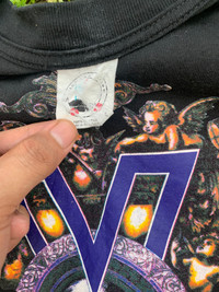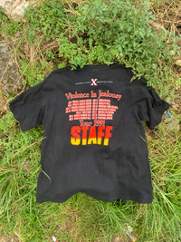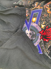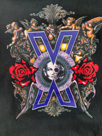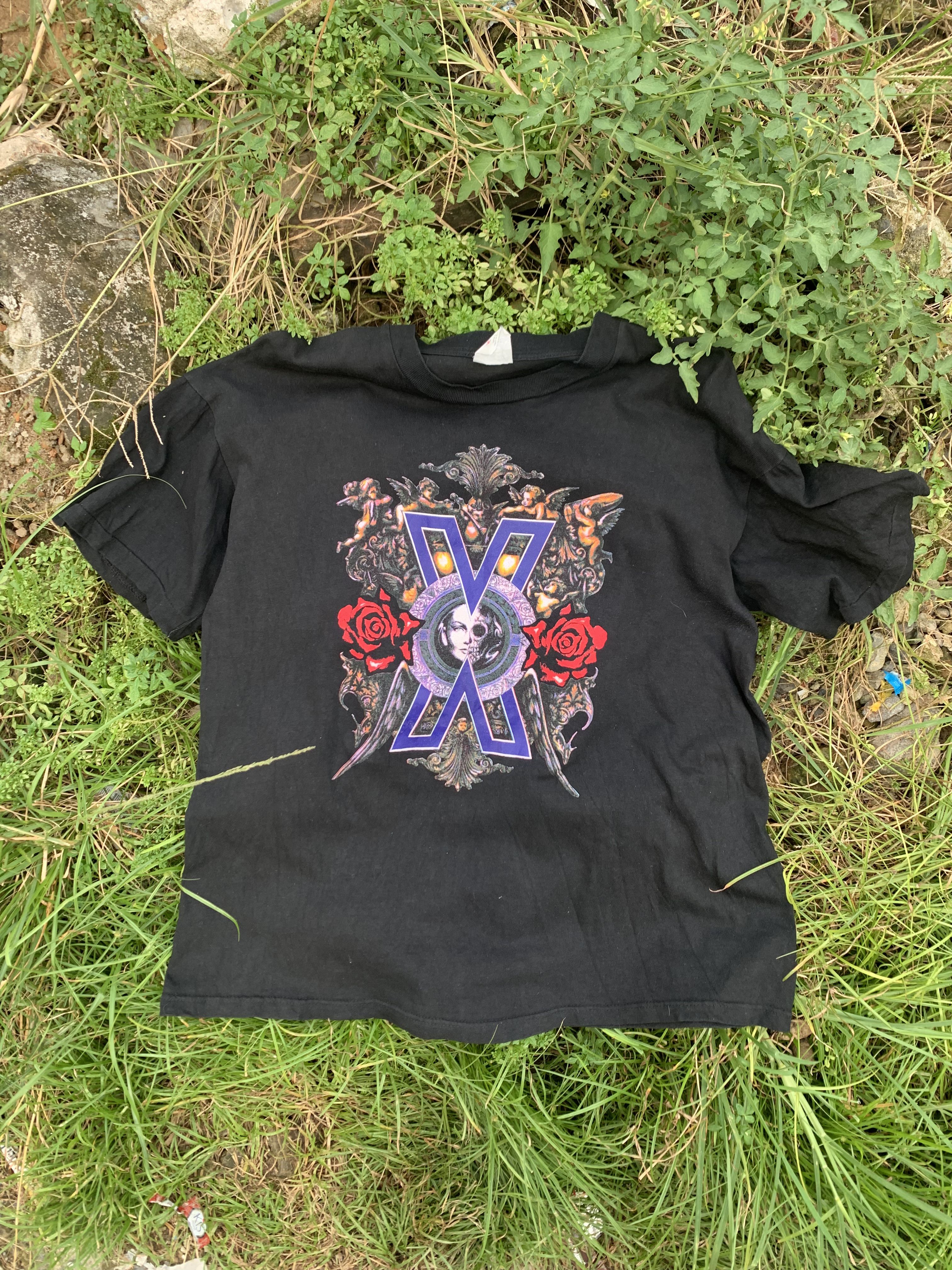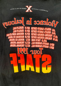X Japan Vintage Staff Tee 1991 Violence In Jealousy Tour Rare Visual Kei Rock Band Shirt El Salvador Tag ⸻ Deskripsi : Original X Japan “Violence In Jealousy” Tour 1991 Staff Tee. Official vintage shirt made only for crew during their legendary Tokyo Dome era. Not sold to public. Rare collector’s item from the peak of Japan’s visual kei scene. Baroque-style front graphic with roses and swords. Full Japan tour dates printed on back. Great for fans of X Japan and Japanese rock history. Size and Measurements: • Width: 58 cm / 22.8 in • Length: 72 cm / 28.3 in Details: • 100% Cotton • Made in El Salvador • Tag faded • Soft vintage feel • Color: Black • Original early 90s Condition: • Light overall fading • Minor cracking on print • Neck tag faded • No holes or major stains • Worn vintage condition Shipping from Indonesia. Feel free to message me with offers or questions. ⸻ Hashtag internasional: #xjapan #xjapanvintage #visualkei #vintagebandtee #jrock #vintagejapan #jrockvintage #grailedvintage #90stee #japanesevintage #tourtee #vintageindonesia #visualkeistyle #rarebandtee #elitesvintage #vintageeurope #vintagethailand #vintagecrewtee #bandshirtarchive