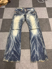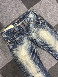 🔔Offer me a price, willing to negotiate🕭 🔹Size in inch(es) on tag M Waist : 31 Outseam :40.5 Inseam :33.5 Front Rise :8 Thigh :11 Knee :8 Leg Opening : 9 🔹Type of Cut : Low Rise,Flare 🔹Condition : 9/10 🔹Colour : Thunderous Fades Denim 🔹Made in : Japan 🔹Material : Cotton 🔹Defect : please refer photos -Please dont hesitate to ask if you have any question. ☡ATTENTION:☡ -An item that has been used or worn previously. Sold as is -See Our listing for full details and description of any imperfections. No refund. -Please don't expect it to be like new or in pristine condition -Please pay close attention to measurements provided. All measurement are taken while laying flat and relaxed(no stretch & no pressure on buttons).Need more photos of measurement ,please ask. -Do not rely on tag size as pre-worn items may have been altered, stretched or shrunk & vintage sizes do not directly translate the modern sizes.The best way to ensure a correct fit is to compare our measurements with the measurements of a similar item that you know fits you well.Please enlarge the photos for clearer image..Due to amateur measurement,please allow plus/minus 0.5 inch accuracy. -For special cut garment ,please refer photos of measurement. PAYMENT And SHIPPING: ■ Accept \"PAYPAL\" only ■ Item above $100 will be shipped via DHL Express and below $100 will be shipped via Standard International Shipping. Or if your price is lower than $100 but urgently need the item ,please add another $25.i will arrange the best shipping company.Tracking Number will be provided. ◾️25USD charge on after sale cancellation. ■Expected Shipping period takes within 3-5 days via DHL Express and Standard International Shipping within 2-3 weeks to arrived to its destination around the world.No shipping to Israel. Don't Worry About Customs Tax or Fees. I usually Declare all Items as 'Gift' & Declare Value of Item Lower than Original Price. All Items are Sold \"AS IS\" so Please be Sure to Read The Entire Description and Look at All The Pictures. Pleased doing business with you mate