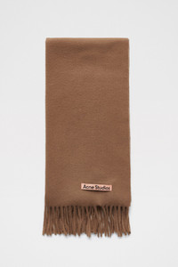 Scarf from Acne Studios made in Italy from pure wool. Rectangular shape with fringed short ends. Pink satin label with black logo on one corner. Details Caramel brown scarf. Made in Italy from 100% wool.ART. NO: CA0210-59C Size & fit Measures approximately 45 x 200 cm.