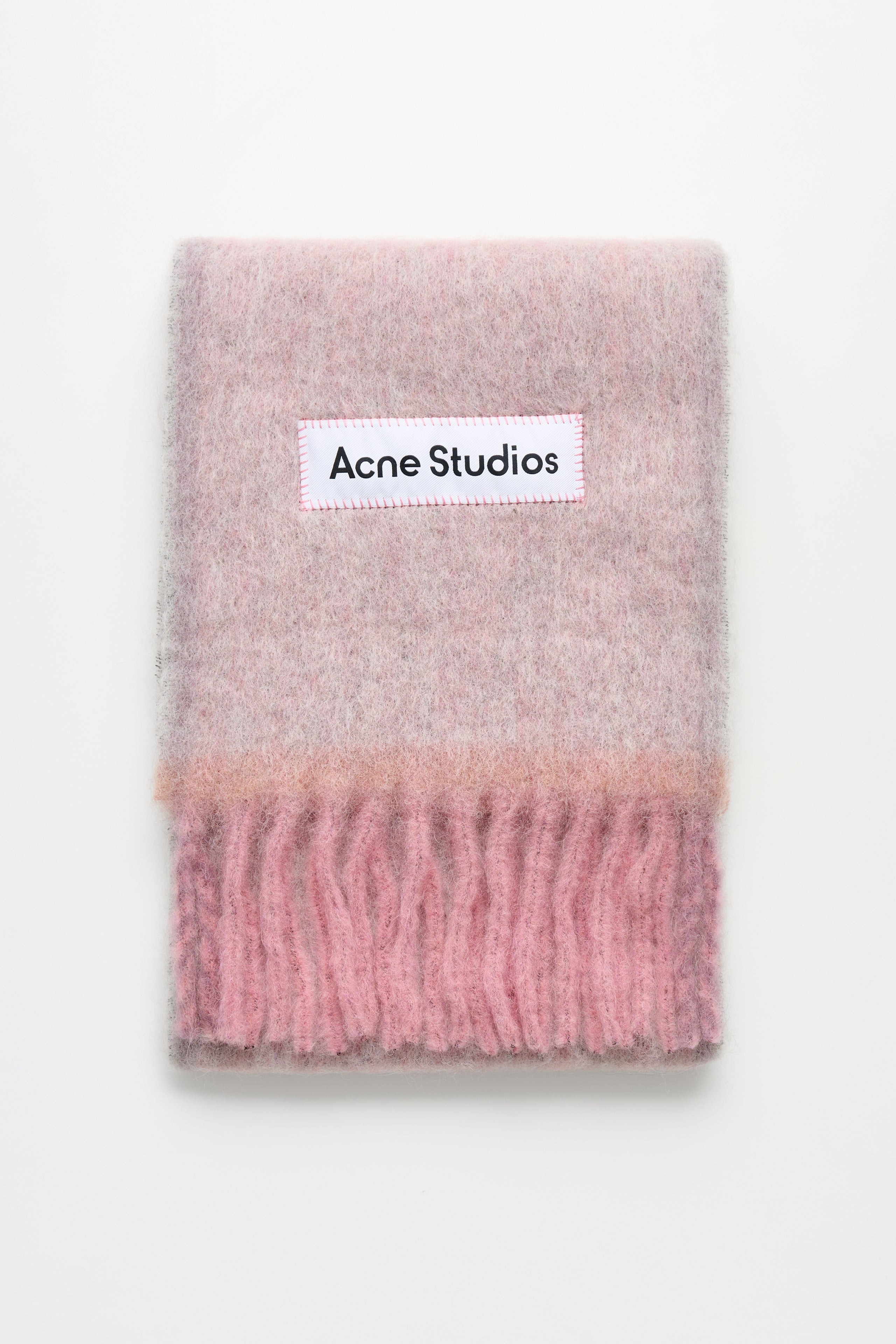 Scarf from Acne Studios. Made in Italy from a soft wool blend of alpaca and mohair. Designed in a rectangular shape with fringed edges. Features a woven contrast frame and an Acne Studios embroidered logo patch. Details Pink, mint green and orange scarf. Made in Italy from 33% alpaca, 25% wool, 22% nylon and 20% mohair.ART. NO: CA0290-416 Size & fit Measures 28 x 250 cm.