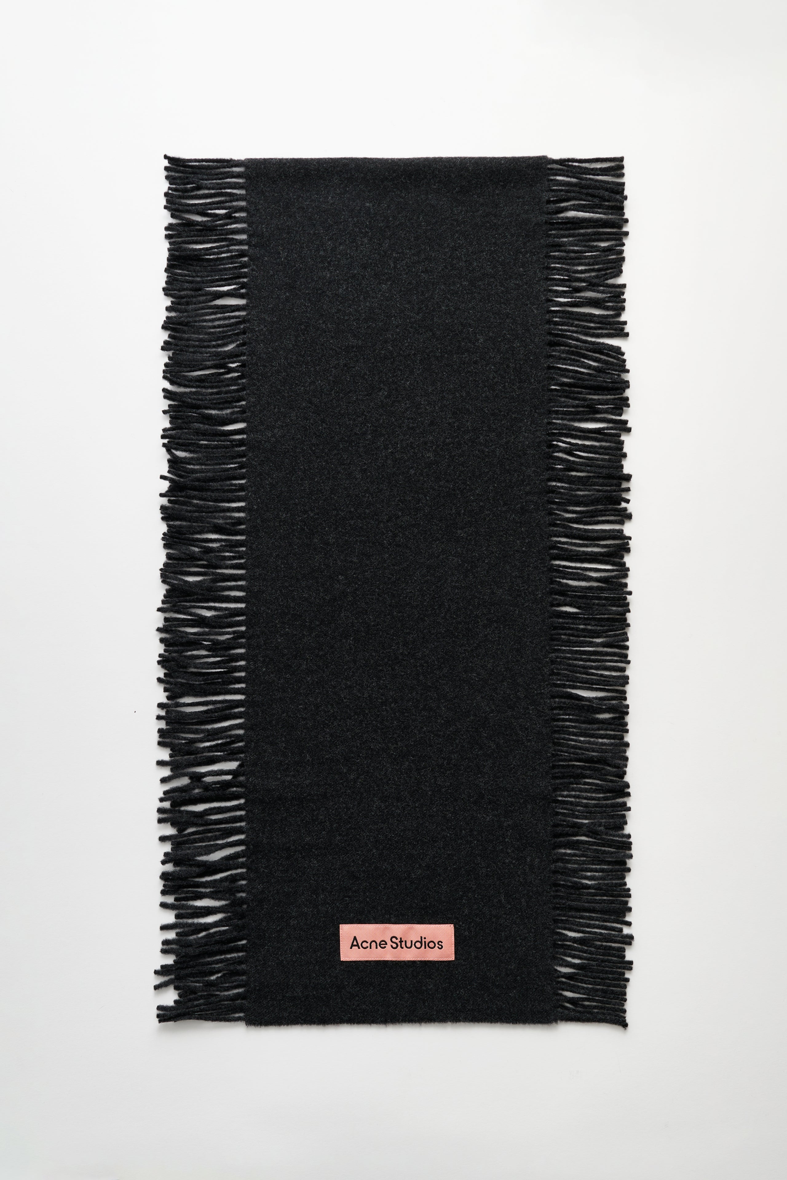 Fringed scarf from Acne Studios. Made in Italy from midweight RWS-certified wool with a soft handfeel. Features lateral fringes and a pink woven brand patch at the hem. Details Black melange scarf. Made in Italy from 100% RWS wool.ART. NO: CA0368-975 Size & fit Measures 175 x 45 cm (including fringe).
