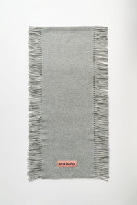Fringed scarf from Acne Studios. Made in Italy from midweight RWS-certified wool with a soft handfeel. Features lateral fringes and a pink woven brand patch at the hem. Details Light grey melange scarf. Made in Italy from 100% RWS wool.ART. NO: CA0368-X92 Size & fit Measures 175 x 45 cm (including fringe).