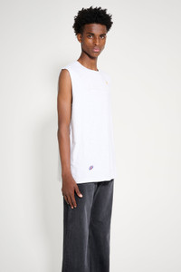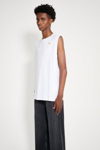 Sleeveless t-shirt from Acne Studios. Made from soft and lightweight stretch cotton with raw edge logo lettering across the chest and trompe l'oeil sticker prints at the front. Finished with stitched edges and a ribbed crewneck. Details Grey melange t-shirt. Made in Portugal from 100% cotton.ART. NO: CL0350-990 Size & fit Unisex fit. Men's size L corresponds to Women's size L. Model wears a size Medium and measures 185 cm with an 83 cm chest.