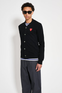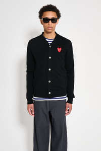 Cardigan from Comme des Garçons Play knitted from a soft wool fabric. Features a V-neck and front button closure. Contrasting sewn on embroidery logo patch on the chest. Ribbed cuffs and hem. Details Black cardigan. Made in Japan from 100% wool. Art. No: P1N076 ART. NO: P1N076 Size & fit Straight fit. Model wears a size Large and measures 188 cm with a 93 cm chest.