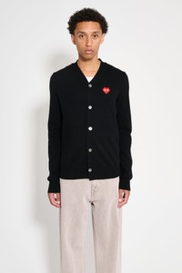 Cardigan from Comme des Garcons Play made in collaboration with Invader. Knitted from soft wool and features a v-neck and front button closure, rubbed cuffs and hem and a pixelated version of the Comme des Garcons Play heart logo patch on the chest. Details Black cardigan with red heart patch. Made in Japan from 100% wool. Art. No: P1N084-1 ART. NO: P1N084-1 Size & fit Regular fit. Model wears a size X-Large and measures 185 cm with a 92 cm chest.