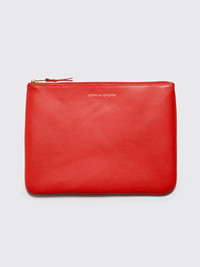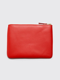 Wallet from Comme des Garcons Wallet. Zip opening with textile trims on one side. Leather pull tab. Contrasting logo embossed on one side. Details Orange wallet. Made in Spain from 100% leather.ART. NO: Size & fit Measures 21,5 x 16,5 centimeters.