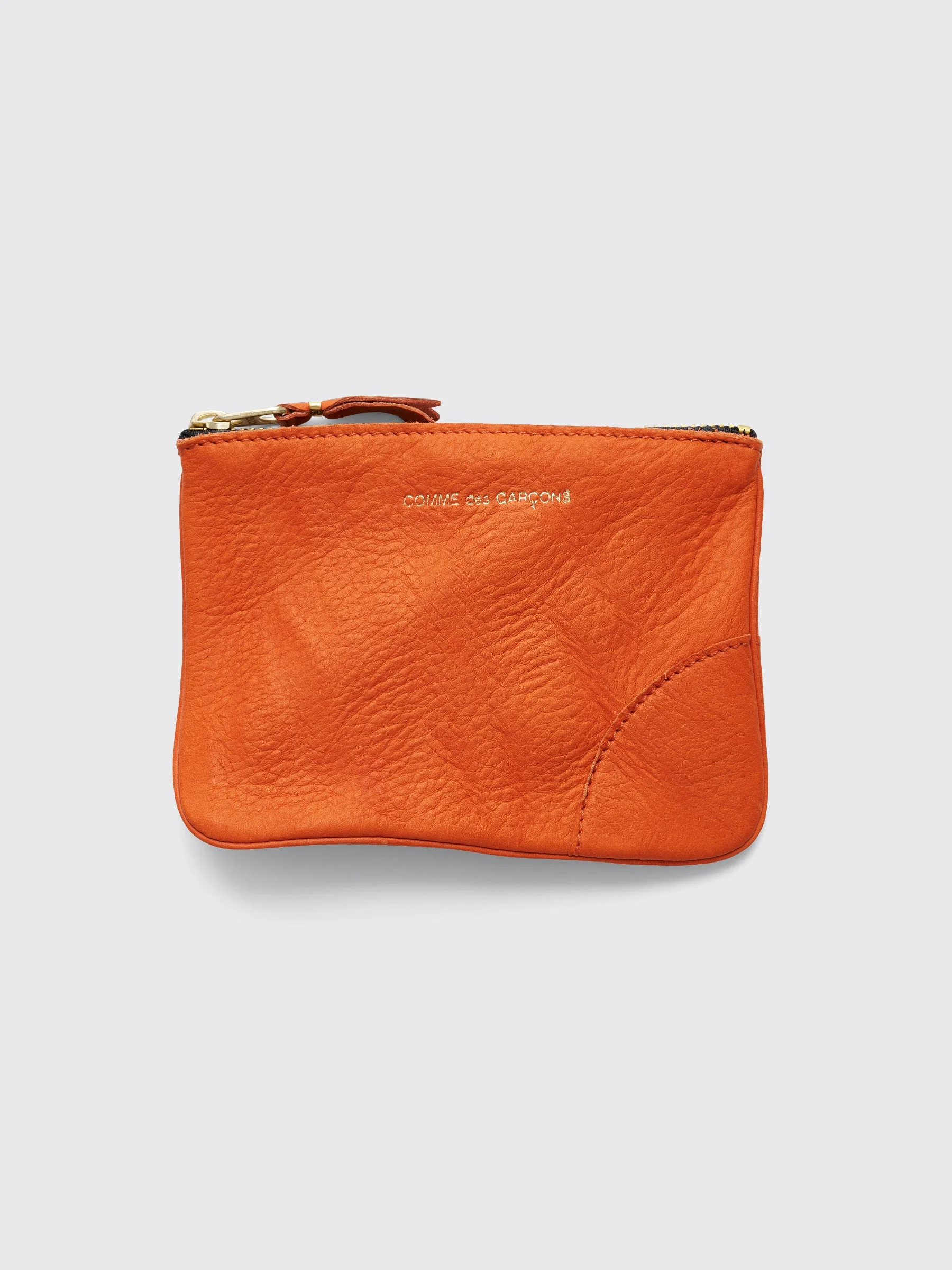 Wallet from Comme des Garcons Wallet. Made from washed grain leather and features a top zip closure with exposed contrast trim and a logo engraved gold tone metal pull tab with a leather tassel. Single inner compartment. Gold foil logo print on the front. Piped edge seams and a reinforced rounded patch at one corner. Details Orange wallet with gold foil print. Made in Spain from 100% cowhide leather. Art. No: SA8100WW-4 ART. NO: SA8100WW-4 Size & fit Measures 10 x 11,5 cm.