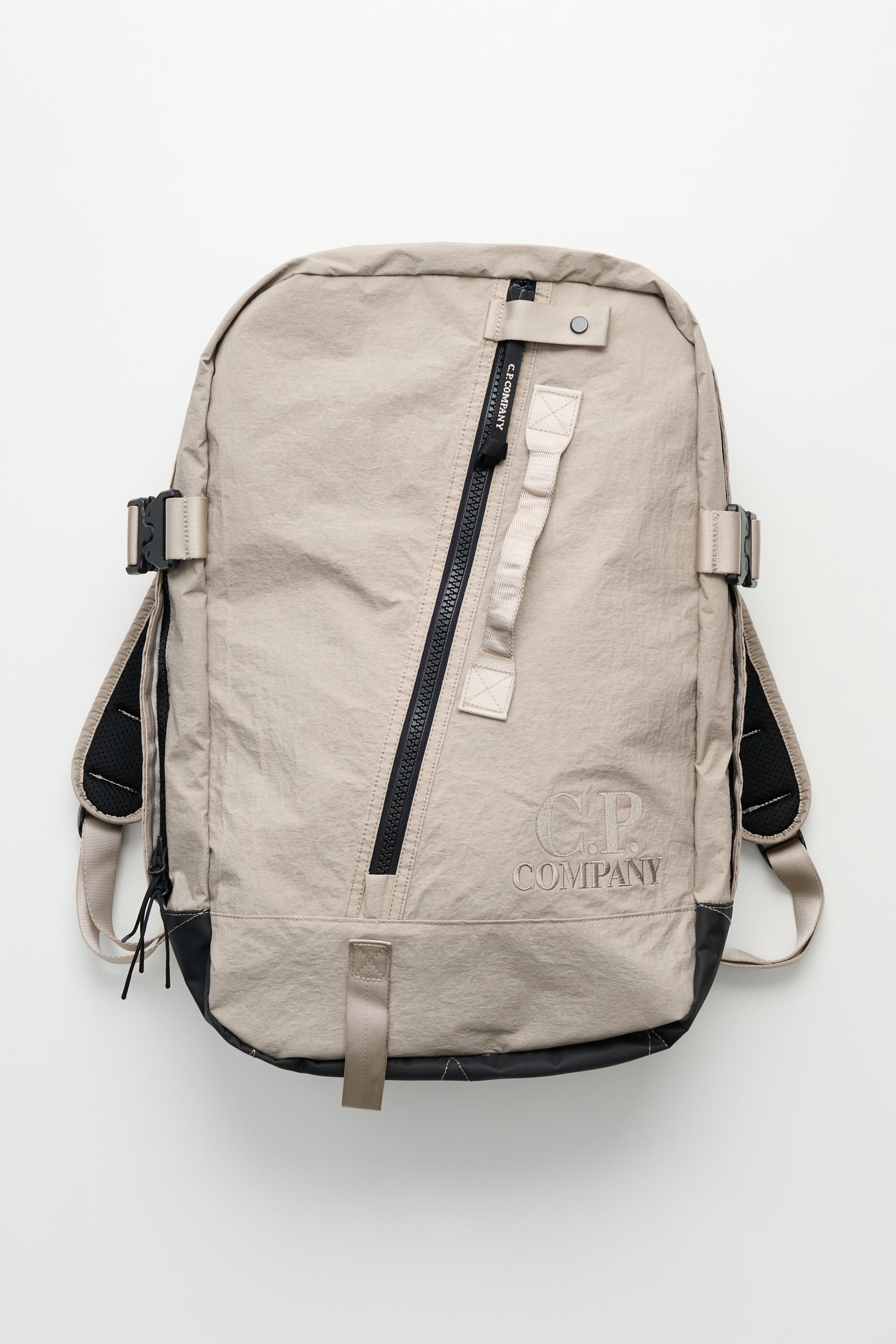 Bag from C.P. Company. Made from garment-dyed nylon fabric. Features adjustable carrying handles, a main compartment with a two-way zip opening, a flap tab, and a buckle closure. Outer compartment with a vertical YKK zipper and branded pull tab. Designed with inner pockets, an embroidered logo detail on the front, and a woven hanger loop with a logo at the back. The bottom is made from stain- and water-repellent fabric with contrasting stitching. Details Beige bag. Made from 100% nylon.ART. NO: 18CMAC174A-110188G-327 Size & fit Measures 38 x 53 x 12 cm.